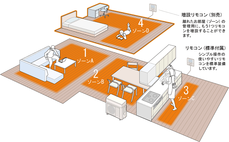 広いリビングルームの一カ所で過ごすとき、お部屋全体を暖めていたのでは不経済。必要な場所だけを暖める「ゾーン暖房」ならエリアを2つに分けて暖房できるから、ムダをとことん切りつめられます。