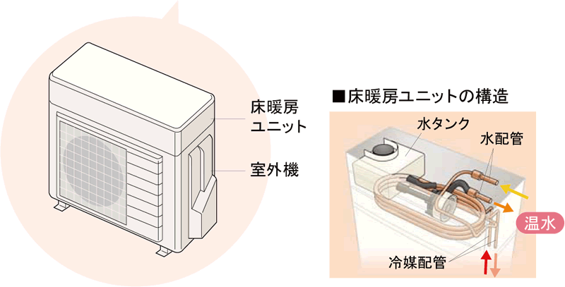 室外機は、エアコンと同じ高効率ヒートポンプ方式。エアコン(暖房)の場合は空気を暖めてお部屋を暖房しますが、床暖房の場合は一体型床暖房ユニットで水を暖めて温水をつくり、その温水を循環させることでお部屋を効率的に床暖房します。